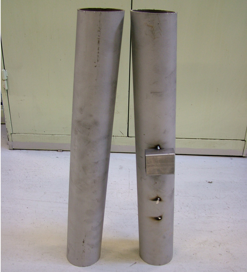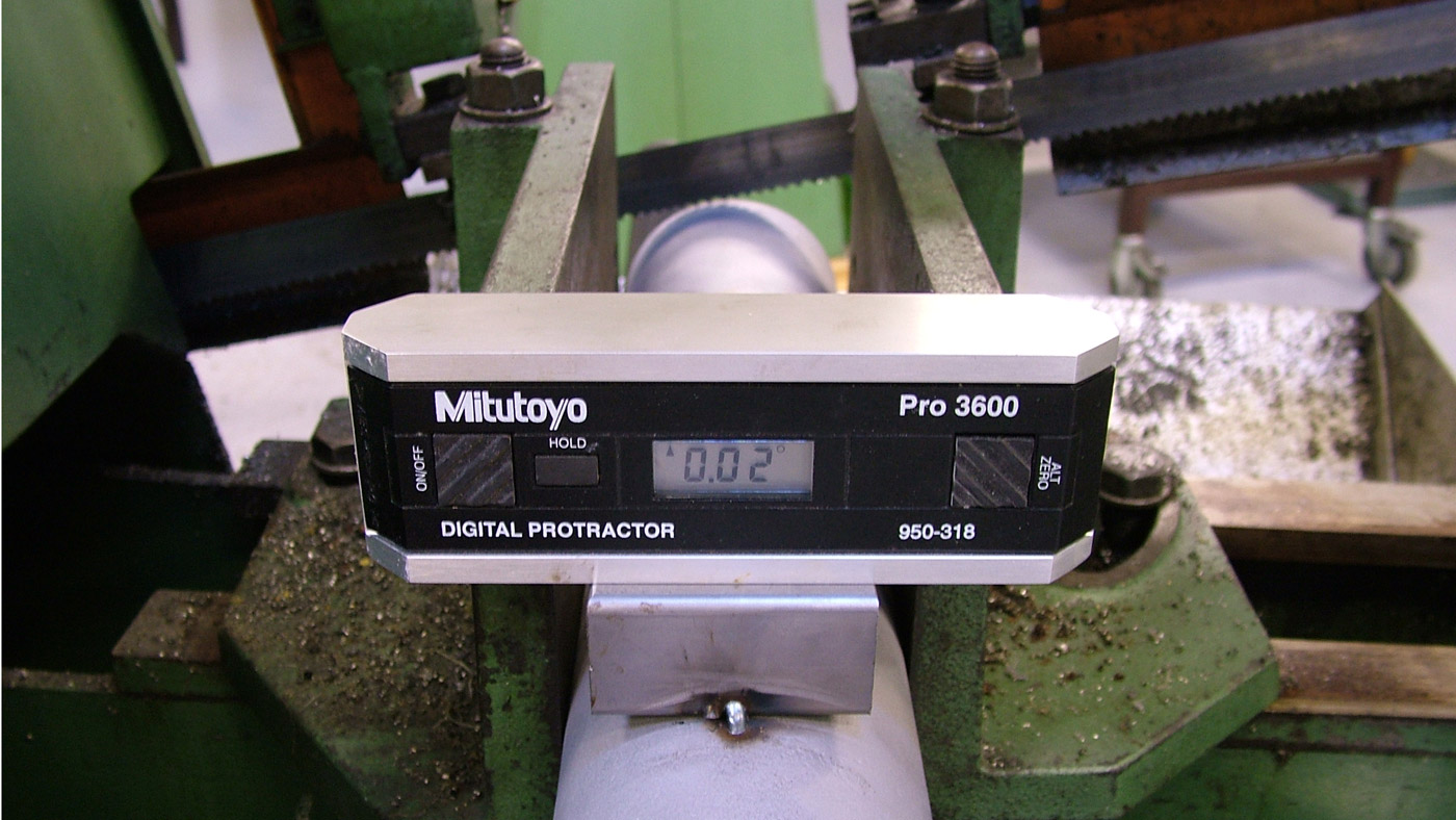 Ovan till höger: Eftersom röret skulle snedkapas i båda ändarna och kapningarna skulle vara parallella med varandra behövdes det ett referensplan för att mäta in det i sågen. Referensplan är ju lite svårt på runda tingestar, men ibland är det svåra enkelt – loppa dit en fyrkantsprofil innan kapning och placera den med lämplig vinkel i sågen så blir båda sidorna parallella!