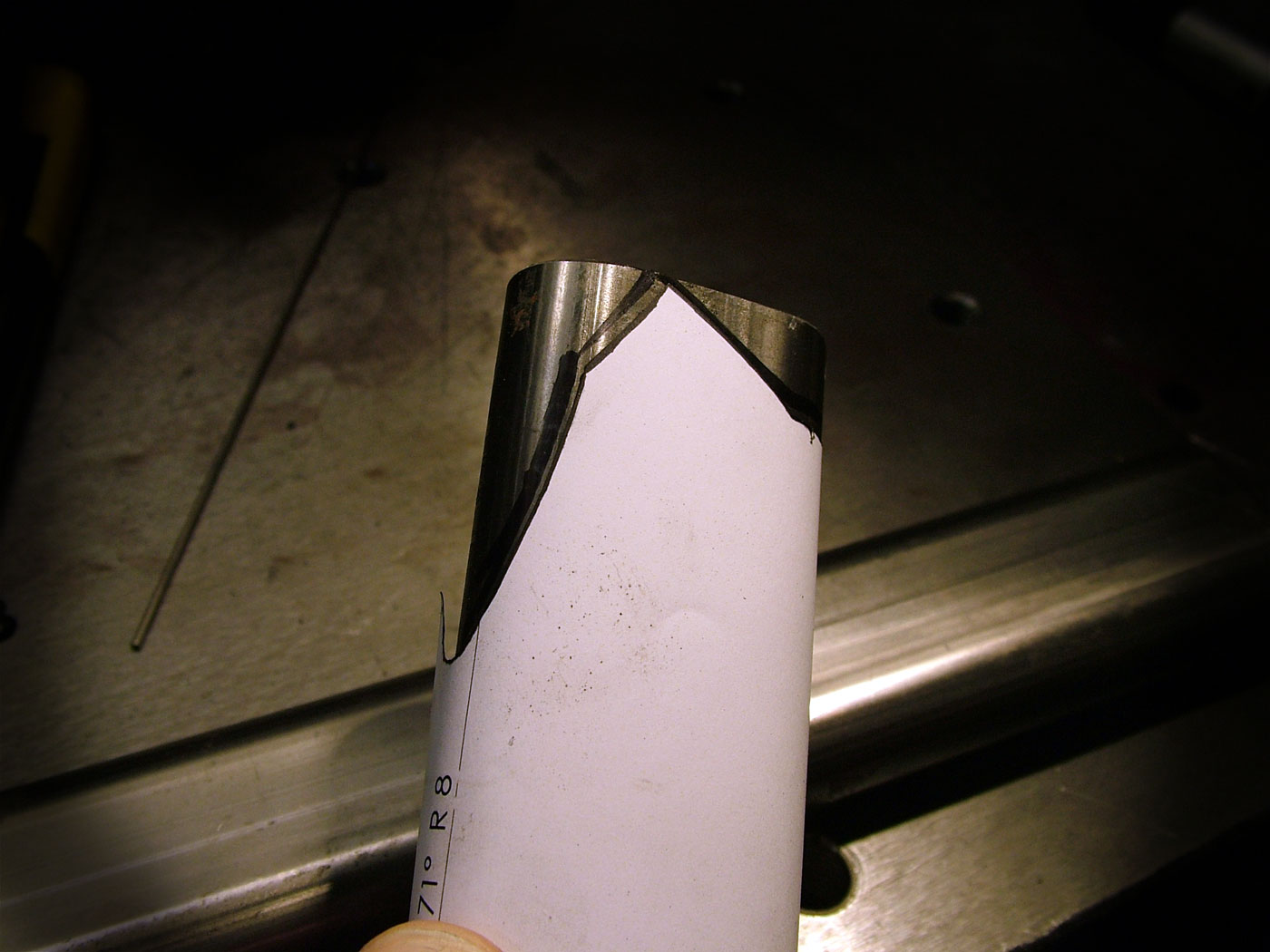 Nedan: Där finns en hel del knasiga rörkapningar i konstruktionerna. Särskilt där rören möter två ytor eller fler. Eftersom det tar en evinnerlig tid att sätta upp rören i fräsen, kapa med hålsåg en, eller två gånger skrivs istället omkretsen ut på ett papper som därefter hålls runt röret och ritas av. Därefter är det inga problem att kapa röret med vikelslipen och jämna till det i bänkslipen. 1 minut totalt, jämfört med 15-20 minuter i fräsen…